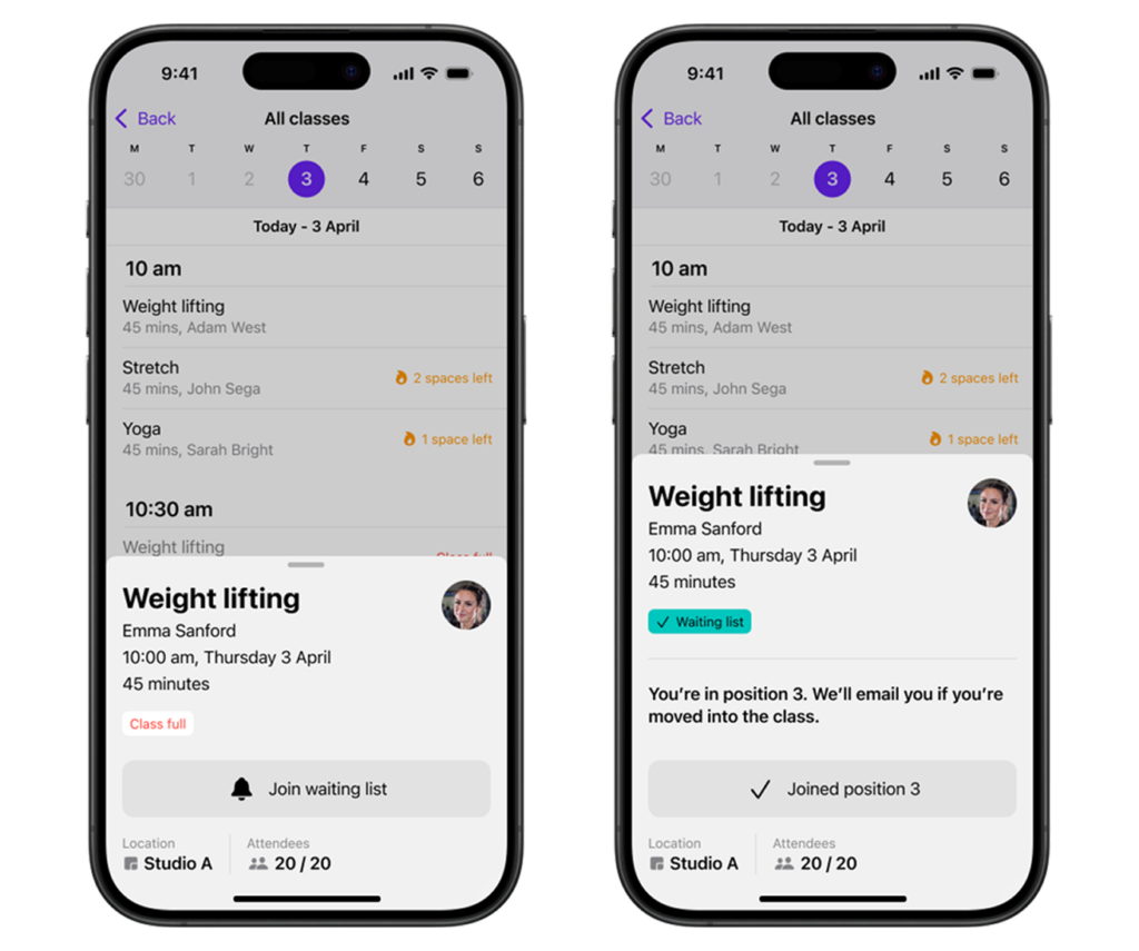 Automated waitlists quietly fill cancelled spots as they open up, helping classes run closer to capacity while reducing manual admin behind the scenes.